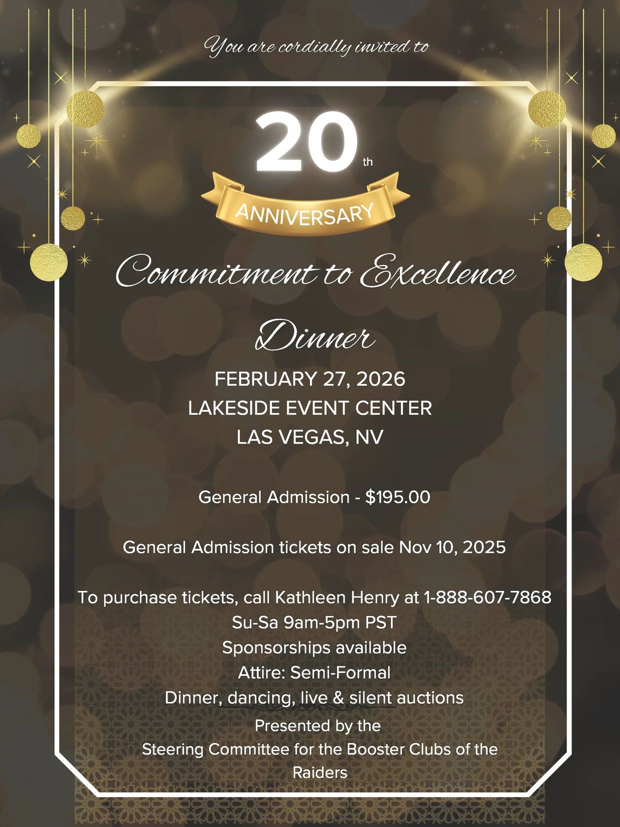 This elegant dinner, hosted by The Steering Committee for the Booster Clubs of the Raiders partnering with the Raider Organization, will be held on February 27, 2026 in Las Vegas, NV at the Lakeside Event Center.